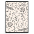 Minimalist pasta pattern wall art with hand-drawn line illustrations of penne, ravioli, fusilli, and spaghetti on a beige background, framed in black for modern kitchen décor.