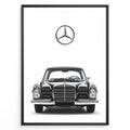 Framed minimalist poster of a black Mercedes-Benz classic coupe front view with large Mercedes logo above on a clean white background.