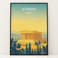 Athens Vintage Travel Plakat | Vintage Travel Poster | Denne plakat viser Parthenon i Athen, Grækenland, i gyldne nuancer med en gradient baggrund fra teal til gul. Perfekt til rejse- og historiefans.