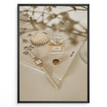 Indlæs billede til gallerivisning Fashion Plakat | Chanel No. 5 Perfume Flat Lay with Watch and Books – Neutral Aesthetic Print Plakaty.dk | Flat lay of Chanel No. 5 perfume bottle, gold watch, ring, and decorative shell on fashion books with soft floral blur in neutral tones.