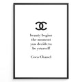 Fashion Plakat | Chanel Quote Poster – “Beauty Begins” Inspirational Wall Art Plakaty.dk | Minimalist poster with the Chanel logo and the quote “Beauty begins the moment you decide to be yourself” by Coco Chanel.