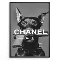 Fashion Plakat | Edgy Chanel-Inspired Art Featuring Dog with Gun Plakaty.dk | Black dog with spiked collar holding a handgun in its mouth, with the word "CHANEL" overlaid in bold white text.