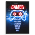Gamer Hard Work gaming plakat | Neoncontroller og stærke ord som hard work og discipline – en motiverende gaming plakat fra Plakaty.dk