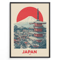 Indlæs billede til gallerivisning Japanske plakater | Retro-style Japan travel poster with a red pagoda, town view, Mount Fuji, and a large red sun, framed in black.
