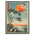 Indlæs billede til gallerivisning Japanske plakater |  Japanese ukiyo-e style art print of white cranes with a pine tree and a vivid red sun over a tranquil lakeside, framed in black.