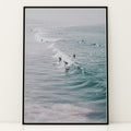 Plakat med hav og surfer | Sommer og Strand Plakater | Denne plakat viser flere surfere, der rider på bølger i det klare, blå-grønne hav. Perfekt til surfere og strandelskere.