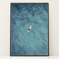 Indlæs billede til gallerivisning Plakat med surfer på bræt | Sommer og Strand Plakater | Dette luftfoto viser en person på et surfbræt midt i et stort, bølgende blåt-grønt hav. Perfekt til strand- og vandeventyrere.