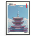 Indlæs billede til gallerivisning Japanske plakater | Illustration of Sensō-ji Temple’s red pagoda in Tokyo with a clear blue sky and Tokyo Skytree in the background, combining traditional architecture with a modern skyline.