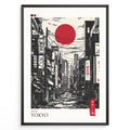 Japanske plakater | Stylized black and gray illustration of a Tokyo street with buildings, power lines, and Japanese signs, featuring a large red sun in the sky.