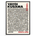 Framed Yayoi Kusama Infinity Dots art poster with layered beige and black circular patterns and red Osaka 1992 text.