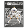 Cristiano Ronaldo fodbold plakat med nummer 7 i Real Madrid hvid trøje under ikonisk jubel på stadion i sort/hvid effekt.