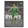 Manuel Neuer fodbold plakat hvor han jubler i Bayerns grønne målmandstrøje med røde handsker under Champions League kamp.
