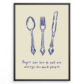Kitchen quote poster with blue spoon, fork, and knife illustrations and the text “People who love to eat are always the best people” on a beige background in a white frame.