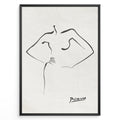 Framed Picasso line art poster depicting an abstract female figure outline in black on a textured beige background.