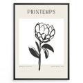 Framed minimalist “Printemps” poster featuring black line art of a blooming flower on a white and beige background.
